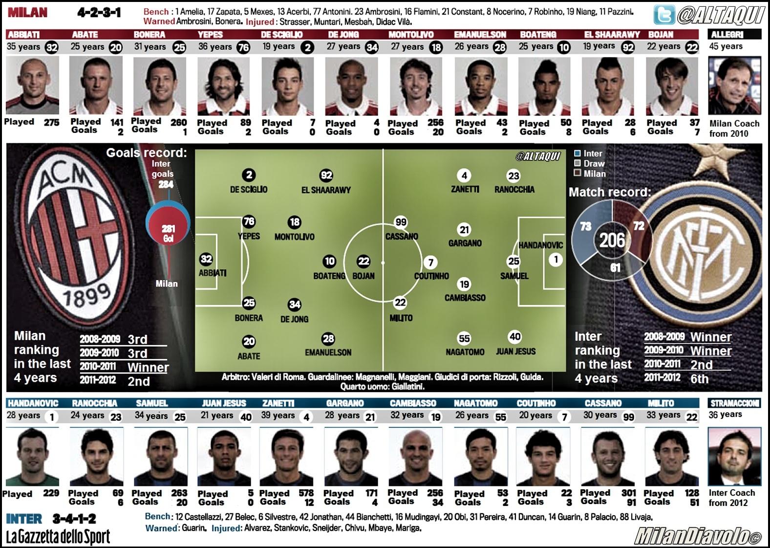 Pogłoski mówiące o odmłodzenie obydwu zespołów nie są tak prawdziwe, jakby to się mogło wydawać. Awizowane przez "La Gazzettę dello Sport" jedenastki mają średnią wieku w wysokości odpowiednio 26,5 lat oraz 28,6. Powiewu młodości trudno wyczekiwać z kierunku ławki rezerwowych, choć na największą gwiazdę tych derbów kreowany jest 19-letni Stephan El Shaarawy. "Faraon" imponuje formą od początku sezonu, to jego kapitalny rajd wydatnie pomógł Milanowi w pokonaniu Zenita Sankt-Petersburg.