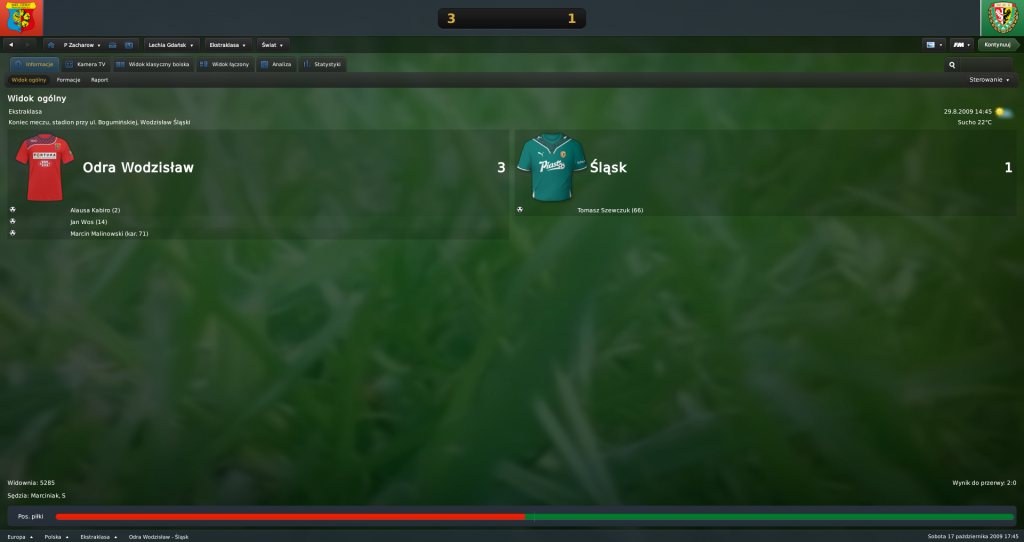 Pomściu: Kiedyś musiał przyjść zimny prysznic. Do Wodzisławia jechaliśmy w najmocniejszym składzie, a ja byłem pewien wygranej. I zbytnia pewność siebie nas zgubiła. Już w drugiej minucie Alausa "pięć tysięcy złotych" Kabiro wbił żądło po raz pierwszy. W 14 minucie popędził z kontrą i dograł taką piłkę, że Woś nie miał najmniejszych problemów z wbiciem jej do bramki. Zmiany w taktyce niewiele dały - mieliśmy przewagę, ale Odra mądrze się broniła. Udało się co prawda strzelić bramkę kontaktową, ale chwilę później popełniłem kolejny błąd - zdjąłem zmęczonego Milę, słabo grającego Subasicia oraz Gancarczyka. O ile Dudek i Ćwielong zagrali przyzwoicie, to ostatnia zmiana była nieporozumieniem. Madej najpierw sprokurował rzut karny dla przeciwników, a później zmarnował przynajmniej dwie stuprocentowe sytuacje i mimo naszej minimalnej przewagi skończyło się pogromem. Kabiro z kolei jest dla mnie kandydatem na transfer sezonu - ściągnięty przez Odrę na 5 tys. złotych w 11 meczach strzelił 5 bramek, zaliczył asystę i 3 razy został graczem meczu. Obecnie jest wart 550 tys. złotych, a jeszcze nie powiedział ostatniego słowa.